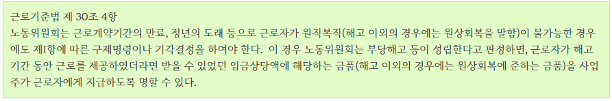 그런데 앞으로는 근로계약기간 만료, 정년 도래 등으로 근로자의 원직복직이 불가능한 경우에도, 부당해고 등이 인정되면 노동위원회가 구제명령을 할 수 있도록 근로기준법이 개정되었습니다. 올해('21년) 11월 19일부터 시행됩니다.