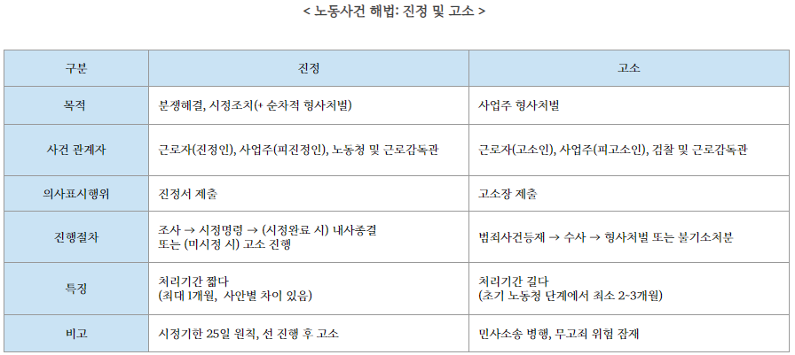노동사건의 해법 중 진정은 고소에 비해 처리기간이 짧다는 것이 장점입니다. 사업주는 노동청에 진정이 제기된 것 자체로도 상당한 압박감을 받을 수 있습니다. 그래서 대개는 신속하고 안전한 접근으로 "선 진정 후 고소"의 순으로 진행하는 경우가 많습니다.
